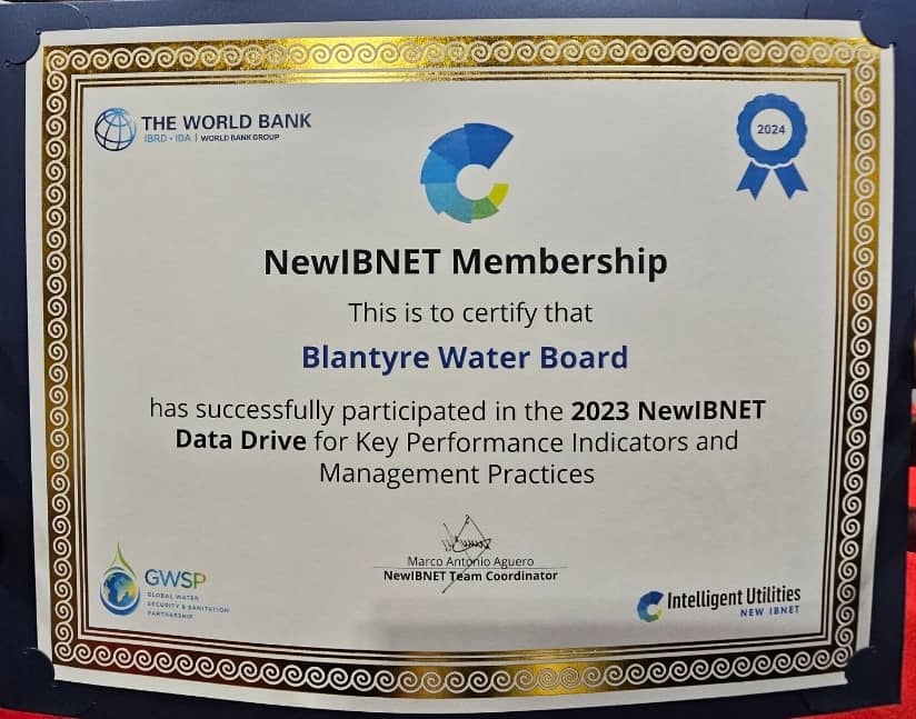 Today at the prestigious IWA World Water Congress & Exhibition in Toronto, Canada, Blantyre Water Board and select Malawian water utilities received recognition for their exceptional contributions to the World Bank's International Benchmarking Network (IBNET) database. We are honored to have received a certificate from the World Bank for our successful participation in the 2023 benchmarking exercise. Read More >>