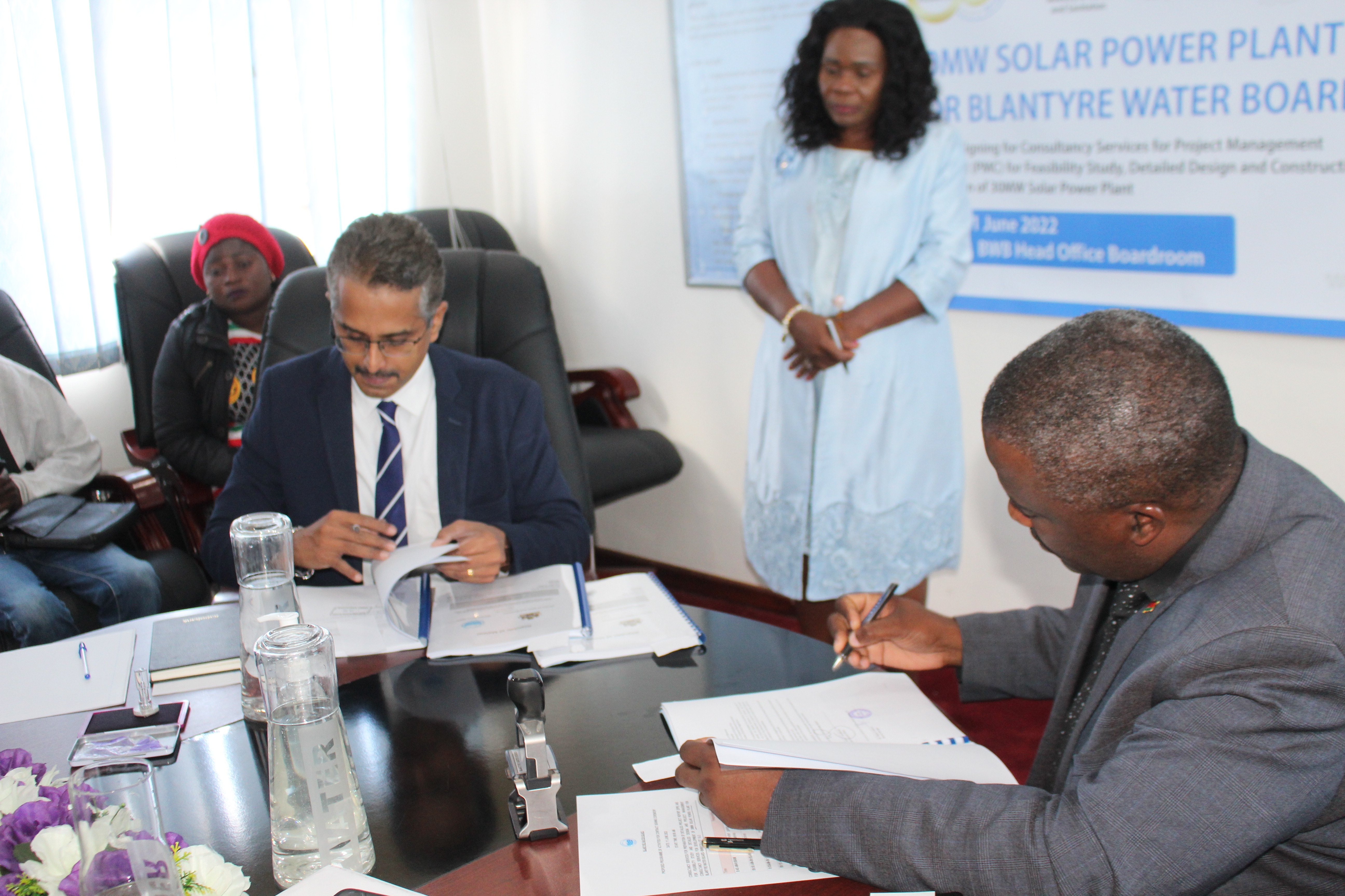 Blantyre Water Board (BWB) on Saturday 11th June 2022 signed a contract with TATA Consulting Engineers Limited empowering them to carryout consulting services that will initiate a Solar Power Plant Project at it's largest pumping station at Walkers Ferry.